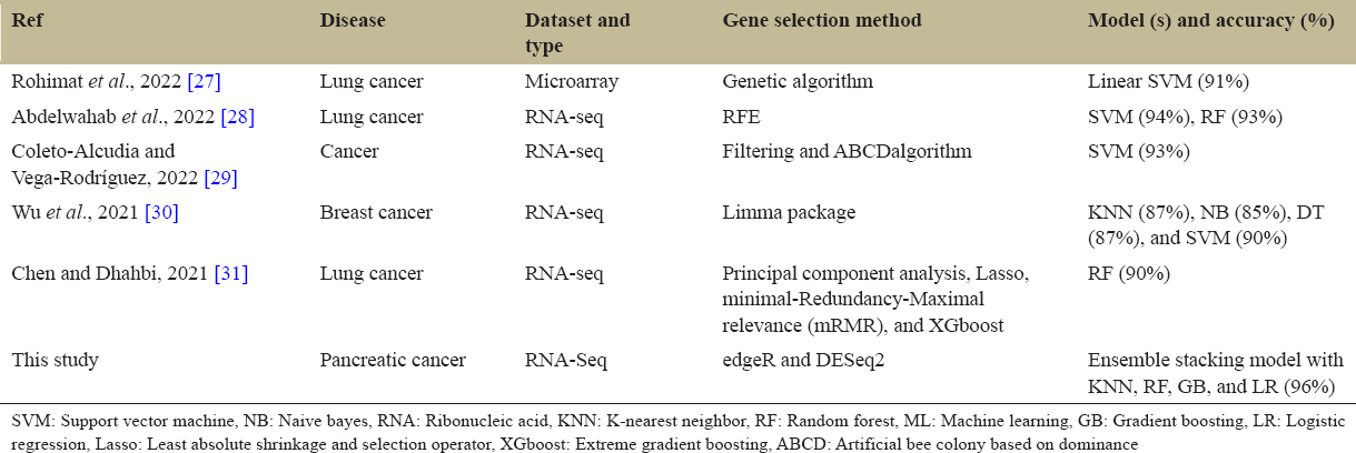 | This study | Pancreatic cancer | RNA-Seq | edgeR and DESeq2 | Ensemble stacking model with KNN, RF, GB, and LR (96%) |