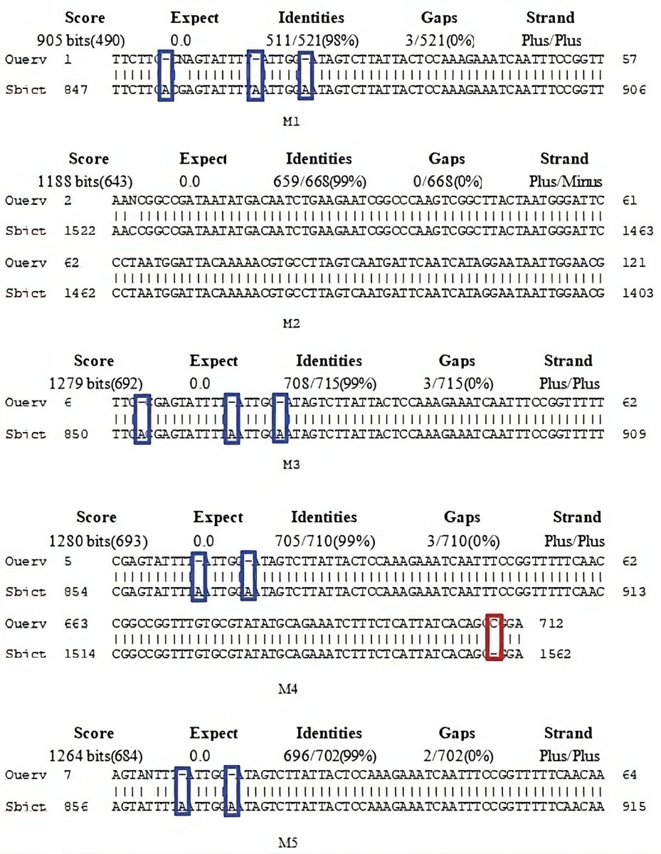 The alignment was associated with mutation processes, and the gaps were associated with deletion (the blue boxes) or insertion (the red boxes) processes [Figure 3]. In the green matoa (M1) and yellow matoa (M3), there were 3 gaps in the same nucleotide sequence, which were caused by a deletion in the query, whereas in the red matoa (M2), there were no gaps between the query and the subject, so they have the highest percent identities (99.44%). The brown matoa (M4) has 3 gaps due to deletions and insertions, while the purple matoa (M5) has 2 gaps in the query.