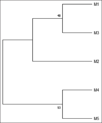 No outgroup was used for the phylogenetic construction because the purpose of this study was to find the nearly identical matoa that were observed. Based on the phylogenetic construction, the matoa were observed to consist of two groups. The phylogenetic analysis has indicated that the red matoa (M2) is closely related to the green matoa (M1) and yellow matoa (M3), though they are separated in different clusters. The brown matoa (M4) and purple matoa (M5) were very close because they belonged to the same cluster.