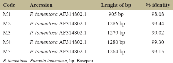 The result of DNA sequencing was a sequence of nucleotides performed by the chain termination method developed by Sanger (1977) [17] that was compared with the closest relatives to determine the species using BLAST analysis based on NCBI [18]. Based on the blast analysis, the nucleotide sequence of all five matoa was closest subject to the species of Pometia tomentosa with accession number AF314802 version number 1 [Table 1]. In this study, the matoa were observed in length from 905 bp to 1286 bp, with identity similarity ranging from 98.08% to 99.44%. The parameters used to determine the similarity of these species were the E-value and Max Score in alignment [Figure 3].
