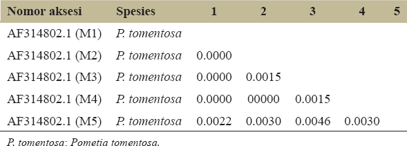 The calculation of genetic distance was to determine the index disimilarity between the types of matoa observed. The pairwise genetic distance of all the five matoa observed has been listed [Table 2]. The overall distance ranged from the lowest 0.000 to the highest 0.0046 between yellow matoa (M3) and purple matoa (M5). These results show that the relationship between the five that matoa were observed was very close; the smallest distance between the saples that were observed was neighbors, which shows that the pair has a very close relationship.
