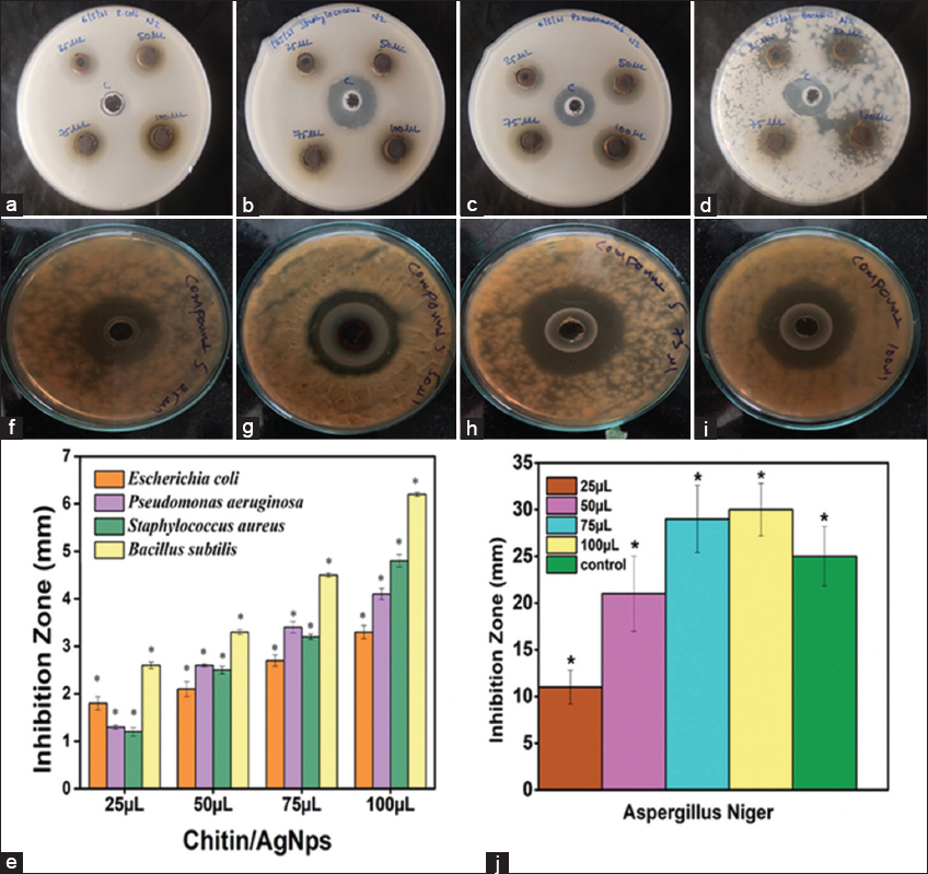 | Figure 5: The antibacterial and antifungal effect of chitin-AgNPs. The images of inhibition zones (a) Escherichia coli, (b) Staphylococcus aureus, (c) Pseudomonas aeruginosa, (d) B. subtilis, and (e, f, g, and h) Aspergillus niger at incremental concentrations (25, 50, 75, and 100 μL), and (i and j) histogram profiles for the zone of inhibition for antibacterial and antifungal activities. SD (Standard deviation) bars derived from the mean of data from three individual experiments with * indicates P < 0.01 [Click here to view] |