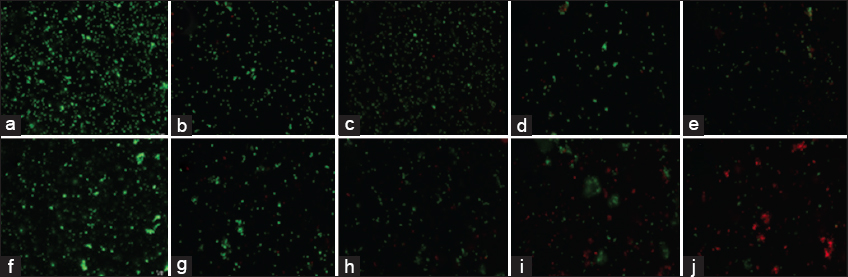 The capability of chitin-AgNPs on E. coli and B. subtilis cells has been examined using the live and dead assay to observe the membrane damage in these cell lines. In this study, for differentiation in the color green and red the E. coli and B. subtilis cells were stained by SYTO 9 and propidium iodide, respectively. The appearance of green color fluorescence in the cells confirms that the intact membrane was making them alive, and the formation of red color fluorescence denotes a damaged cell membrane vis a vis dead cell. E. coli cells (control) display a characteristic intact morphology with intense green fluorescence [Figure 6a]. The chitin-AgNPs treated E. coli cells with incremental addition (25, 50, 75, and 100 μL) display a decrease in the number of green fluorescent cells and an increase in the cells with red fluorescence [Figure 6b-e]. Similarly, the B. subtilis (control) exhibits a distinctive intact morphology with intense green fluorescence [Figure 6f]. The chitin-AgNPs treated B. subtilis with incremental addition (25, 50, 75, and 100 μL) displays a decrease in the number of green fluorescent cells and there is an increase in the cells with red fluorescence [Figure 6g-j]. This effectively confirms that the synthesized chitin-AgNPs have a significant bactericidal effect on both E. coli and B. subtilis, showing excellent antimicrobial efficiency.