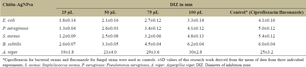 *Ciprofloxacin for bacterial strains and fluconazole for fungal strain were used as controls. ±SD values of this research work derived from the mean of data from three individual experiments, S. aureus: Staphylococcus aureus, P. aeruginosa: Pseudomonas aeruginosa, A. niger: Aspergillus niger, DIZ: Diameter of inhibition zone.