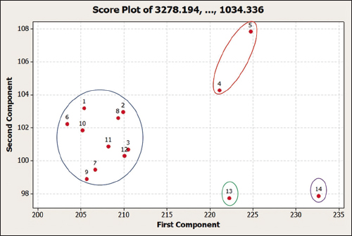 | Figure 6: Score plot of PC1 and PC2 from 14 samples of Orthosiphon stamineus leaves harvested from different locations. Number 1-14 denotes the sample origin: Tawangmangu, South Jakarta, Surabaya, Lamongan, Gresik, Batu, Ngawi, Jombang, Sampang, Mojokerto, Madiun, Kediri, Badung, and Kotabaru. [Click here to view] |