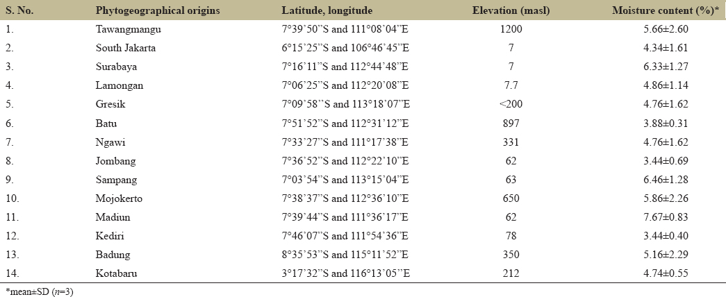 | S. No. | Phytogeographical origins | Latitude, longitude | Elevation (masl) | Moisture content (%)* |