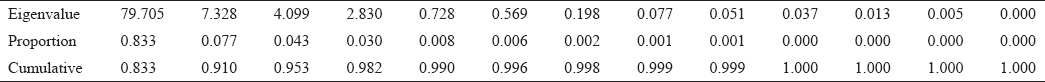 | Eigenvalue | 79.705 | 7.328 | 4.099 | 2.830 | 0.728 | 0.569 | 0.198 | 0.077 | 0.051 | 0.037 | 0.013 | 0.005 | 0.000 |