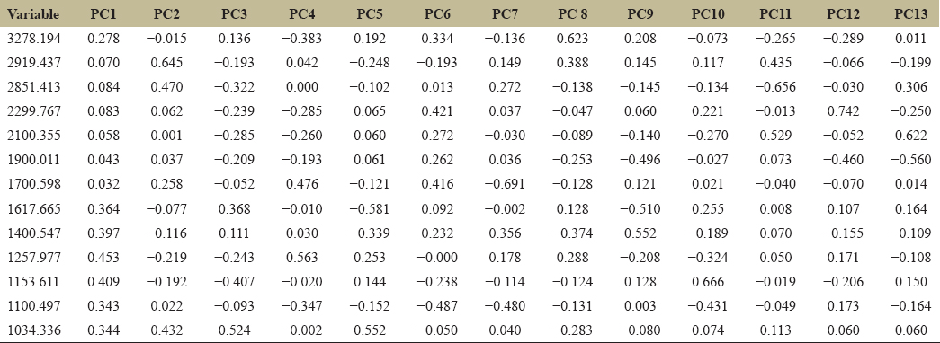 | Variable | PC1 | PC2 | PC3 | PC4 | PC5 | PC6 | PC7 | PC 8 | PC9 | PC10 | PC11 | PC12 | PC13 |