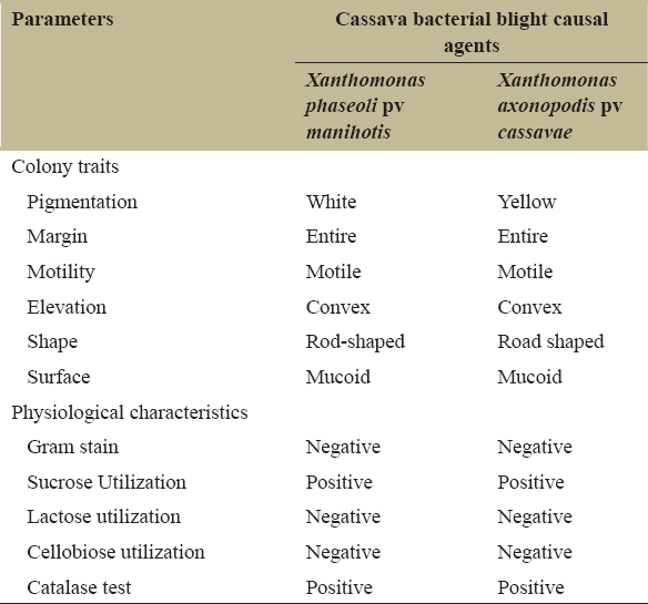 Table 1: Morphological and physiological characteristics of isolated cassava bacterial blight causal agents.