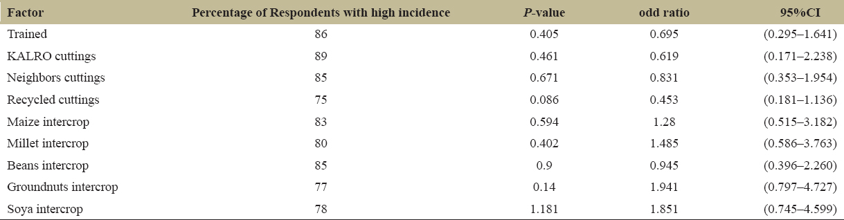 The association between incidence, training, seed source, and intercrop was neither significant (P > 0.005) nor strong as the confidence interval values included 1. This indicated that other factors as causes of elevated the CBB incidence [Table 3].