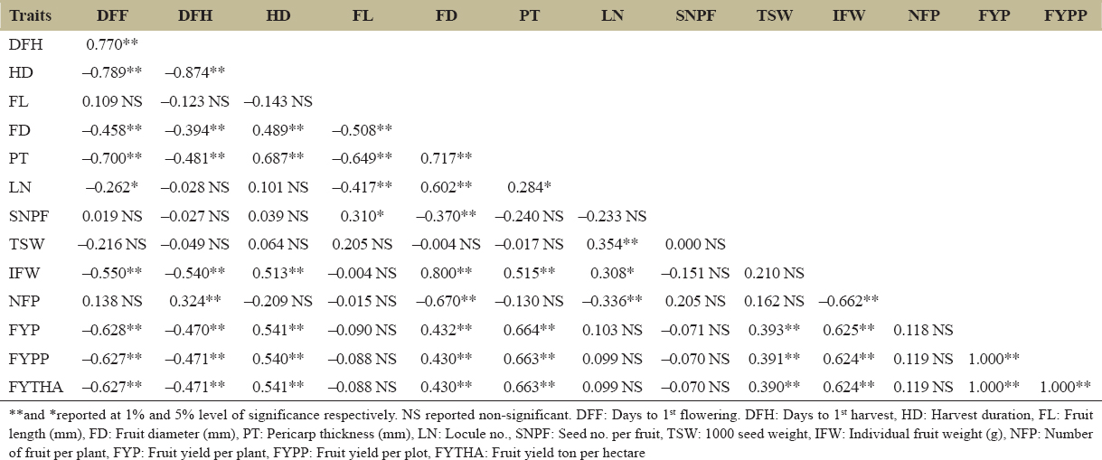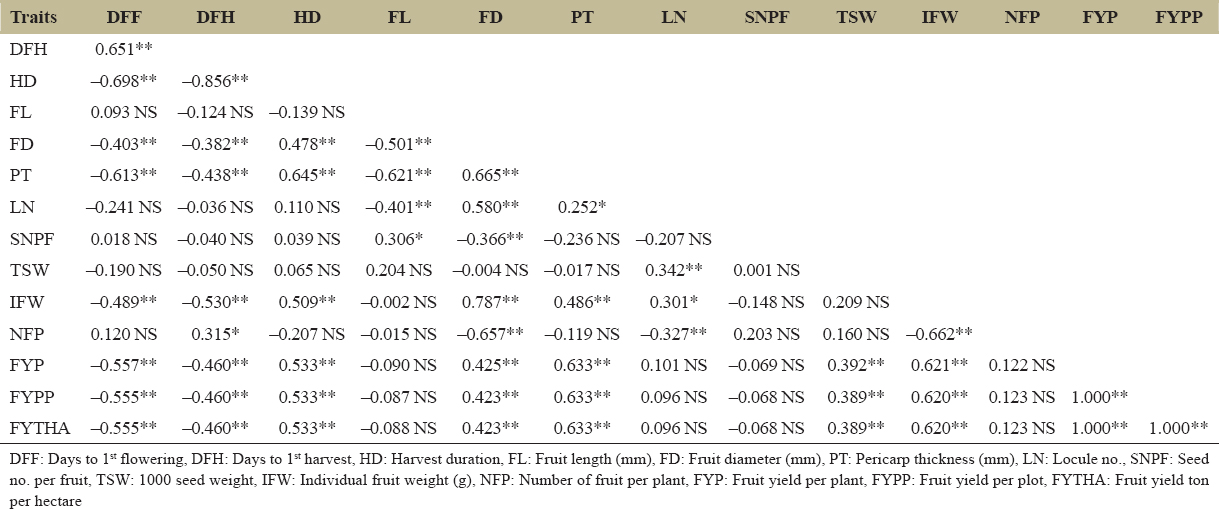 * reported at 1% and 5% level of significance respectively. NS reported non-significant. DFF: Days to 1st flowering. DFH: Days to 1st harvest, HD: Harvest duration, FL: Fruit length (mm), FD: Fruit diameter (mm), PT: Pericarp thickness (mm), LN: Locule no., SNPF: Seed no. per fruit, TSW: 1000 seed weight, IFW: Individual fruit weight (g), NFP: Number of fruit per plant, FYP: Fruit yield per plant, FYPP: Fruit yield per plot, FYTHA: Fruit yield ton per hectare
