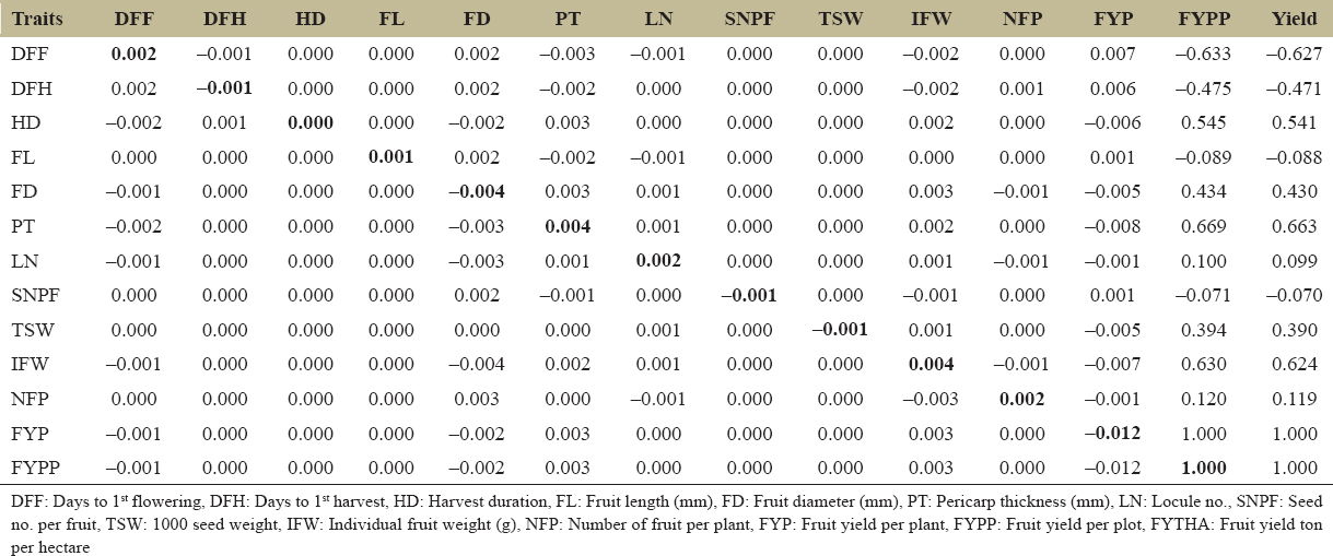 DFF: Days to 1st flowering, DFH: Days to 1st harvest, HD: Harvest duration, FL: Fruit length (mm), FD: Fruit diameter (mm), PT: Pericarp thickness (mm), LN: Locule no., SNPF: Seed no. per fruit, TSW: 1000 seed weight, IFW: Individual fruit weight (g), NFP: Number of fruit per plant, FYP: Fruit yield per plant, FYPP: Fruit yield per plot, FYTHA: Fruit yield ton per hectare