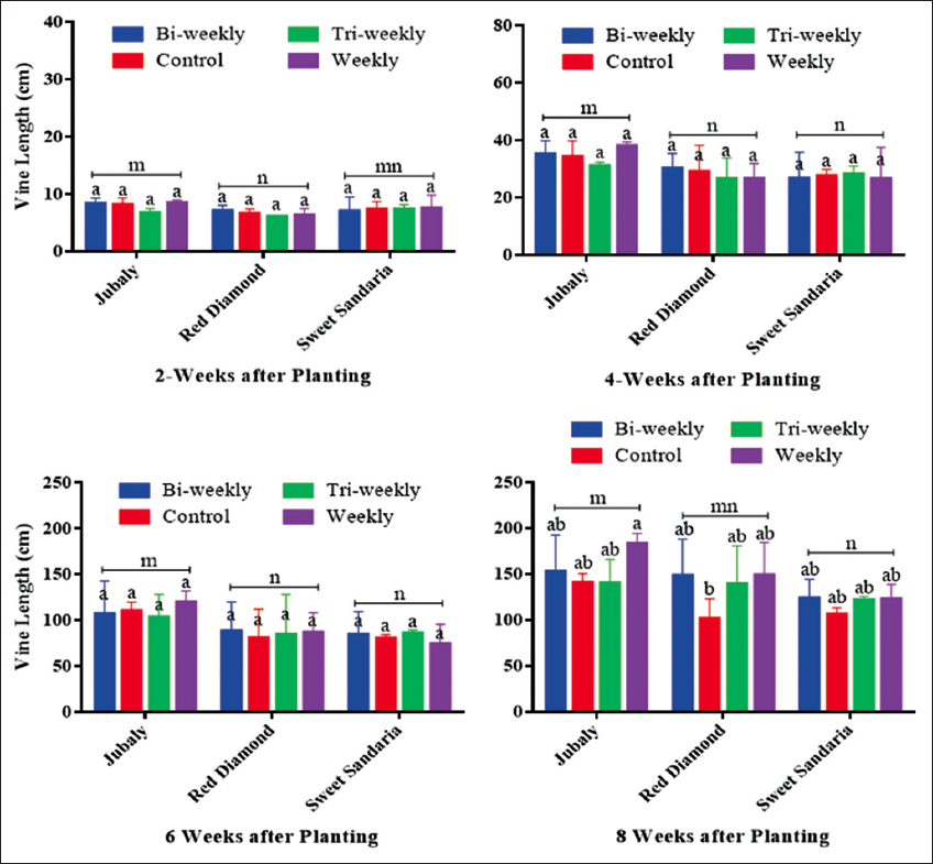 | Figure 2: Effect of variety and spraying regimes on vine length of watermelon. The graph shows the mean values and standard deviations of 3 replicates. Bars with different letters are significantly different at P<0.05. [Click here to view] |