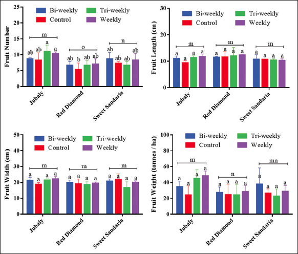 The effect of variety and spraying regime on fruit yield and yield traits of watermelons are shown in Figure 4. There was a clear varietal effect (P < 0.05) on fruit number and fruit weight, but not on fruit length and fruit width. The Jubaly variety was superior in fruit number (9.58) and fruit yield (38.04 t/ha) compared to the red diamond variety, which was the least in fruit number (6.42) and fruit yield (26.09 t/ha). There was no clear-cut varietal effect on fruit length and fruit width as all varieties showed comparable values.