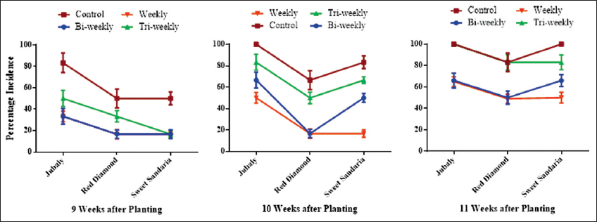 Weekly and bi-weekly sprays showed similar effects on the incidence of Fusarium wilt recording the least percentage incidence (22%) at 9 WAP. However, at 10 and 11 WAP, the weekly spraying regime was more effective, recording the least percentage incidences of 28% and 55% compared to control with the highest incidences of 83% and 94%, respectively. In general, the varieties showed a higher preference for weekly spray, than bi-weekly, tri-weekly, and no-spray, respectively [Figure 5].