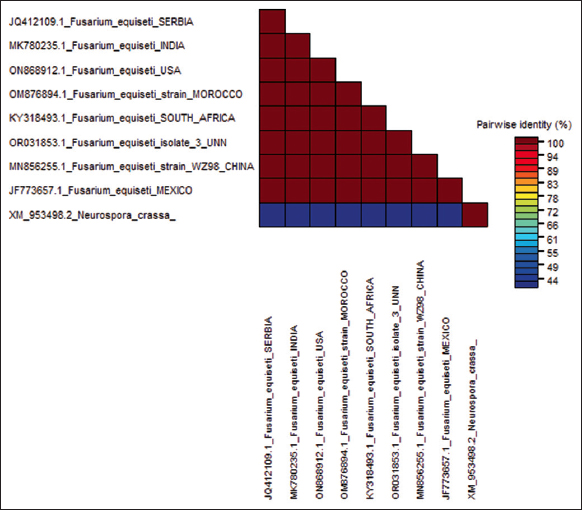 Phylogenetic analysis was conducted to compare the UNN sequence with sequences isolated from watermelon in other countries. Using (MEGA version 11) and the SDT, high similarity was observed between the UNN isolates and other isolates [Figures 7 and 8]. Specifically, the UNN isolate formed a clade with other F. equiseti isolates. Although it did not fall within the same clade as the out group N. crassa, it is possible that the out group shares some ancestral lineage with other species, despite appearing more distant. This report is in tandem with the observations of Hami et al. [44] and Srimali et al. [45] in other Fusarium species. However, closely related species clustered together, consistent with bootstrap values. Utilizing the SDT (SDT version 1.2) for pairwise sequence comparison revealed a high pairwise identity of approximately 94–100% between the UNN isolates and other isolates, in contrast to the out group N. crassa, which exhibited only a 44% similarity.