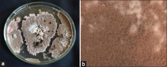 | Figure 1: (a) Mycelial growth on potato dextrose agar plate. (b) Stereomicroscopic view of YS-1 strain. [Click here to view] |