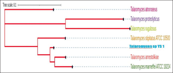 The phylogenetic analysis of the Talaromyces spp. sequenced in the present study (YS-1 Strain) was compared with the isolates available in the database. Three groups could be identified in the phylogenetic tree, with the Talaromyces YS-1 strain forming a close relationship with Talaromyces amestolkiae, Talaromyces marneffei, and Talaromyces stipitatus in the first group. The second group consisted of Talaromyces proteolyticus and Talaromyces rugulosus. The other species Talaromyces atroroseus, formed a separate group [Figure 2].