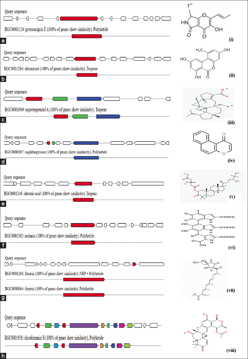 AntiSMASH analysis showed the presence of 76 secondary metabolite BGCs, which include 28 T1Polyketide synthases, 10 Nonribosomal peptide synthetases (NRPSs), 9 terpene, 1 Indole, 12 NRPs like 4 T1 Polyketide synthase (T1 PKS) and NRPs like, 2 T1 PKS Indole, 1 NRPs like terpene, 3 NRPs T1 PKS, 1 Indole NRPs, 2betalactone 1 phosphonate, 1 fungal-RiPP T1 PKS and 1 Other type [Table 1]. Over 40% of these BGCs indicated gene homologies with known clusters in the MIBiG database. Several clusters responsible for coding bioactive compounds such as Pyranonigrin-A, Alternariol, Asperterenoid-A, Naphthopyrone, Clavaric acid, Melanin, and Fusarin showed 100% similarity.