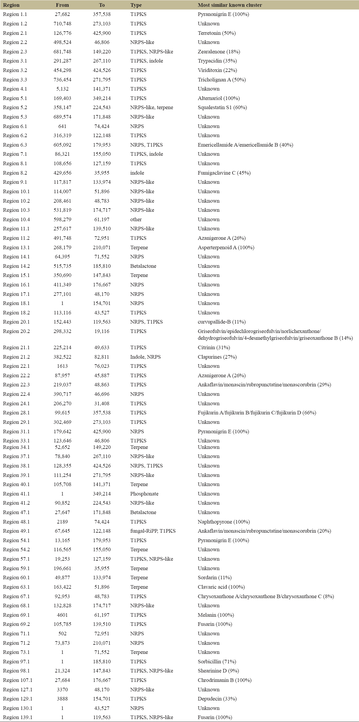| Region 48.1 | 2189 | 74,424 | T1PKS | Naphthopyrone (100%) |