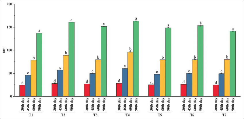 Root length is a prominent factor in metal uptake and accumulation. Root length increased as the days advanced in the experiment [Figure 1]. The highest root length was observed in Guinea grass treatment applied with citric acid as a chelator at 5 mmol/kg of soil (12.6 cm). Among the treatments applied with inorganic chelators, EDTA has been shown to have a maximum root length (10.7 cm) next to citric acid. The lowest root length (9.5) was observed in control (T1) without applying chelators on the 90th day.