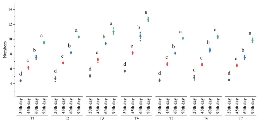 In general, the number of Guinea grass tillers increased with the crop’s duration. All treatments significantly increased except the control [Figure 3]. The highest number of tillers was observed in the treatment with citric acid as a chelator (12.6). The second-highest number of tillers was observed in the treatment with malic acid (11). The oxalic acid and EDTA at 5 mmol/kg of soil had a similar number of tillers (10.3) on the 90th day. The control without chelators had the lowest number of tillers (9.5) on the 90th day of the experiment. Initially, all rooted slips of Guinea grass had a single tiller.