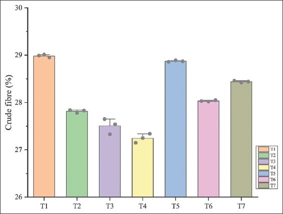 | Figure 4: Effect of chelators on crude fibre (%) of guinea grass (90th day). [Click here to view] |