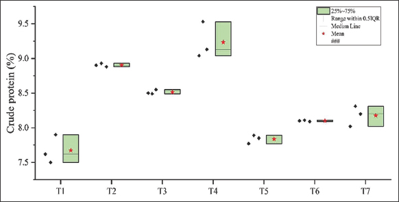 The application of iron chelate sources significantly affected crude protein content [Figure 5]. The crude protein content increased irrespective of the treatments as the days advanced. The highest crude protein was recorded in the treatment applied with citric acid (9.2%), followed by the treatment with oxalic acid (8.9%). Citric acid application gradually enhanced protein contents (leaves and roots) [14]. The lowest crude protein content was noted in treatments without chelators (7.6%). Among the synthetic chelators, the highest percentage of crude protein was recorded in EDTA-amended treatment (8.1%), and the lowest percentage was vested with EDDHA-treated soil (7.8%) at 5 mmol/kg. Like legume fodder, Guinea grass has a high crude protein content [7]. It was also discovered that mineral supplementation significantly raised total carbs and crude protein percentages. Improved protein content could be attributed to enhanced food absorption, an essential protein synthesis component [15]. Dairy animals require an optimal concentration of protein and trace metals as a nutrition source to produce sustainable milk [16]. In certain cases, the use of foliar micronutrients increased crude protein and dry matter digestibility by 1.9–11% and 8–19%, respectively, while decreasing crude fiber content in non-traditional crops.