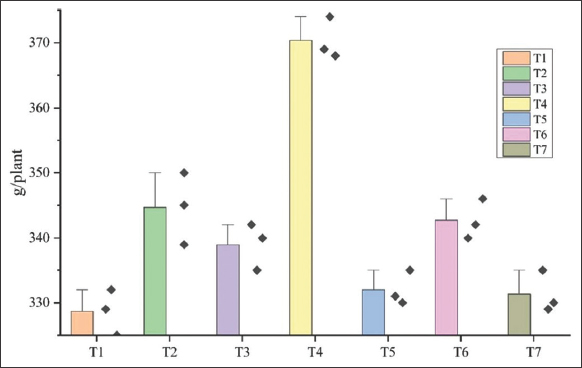 Green fodder yield is an important parameter in deciding the quality of the fodder. Green fodder yield increased in all treatments irrespective of the chelators [Figure 6]. The highest yield was recorded in the treatment with citric acid (370.3 g/plant), and the lowest was in the treatment without any chelators (328.6 g/plant). Among the treatments amended with synthetic chelators, the highest green fodder yield was recorded in the EDTA treatment (342.6 g/plant) and the lowest in the DTPA treatment (331.3 g/plant). A good chelator may facilitate the movement of nutrients as well which is necessary for green fodder production. It was discovered that [17] amino acids and organic acids have a chelating effect on metal nutrients, and when combined with micronutrients, soil absorption and translocation of micronutrients inside plant tissues improve.