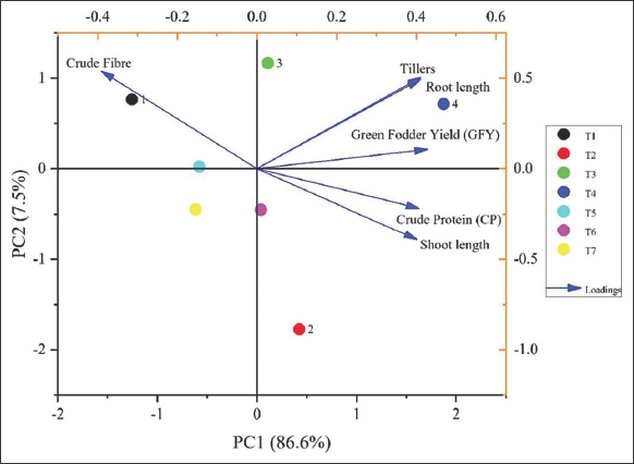 The principal component analysis on the 90th day was carried out as PC1 (86.6%) and PC2 (7.5%) [Figure 8]. The results showed a high correlation between citric acid (T4) application at 5 mmol/kg and Guinea grass root length, number of tillers, and green fodder yield. The principal component analysis had treatments amended with citric acid (T4) and malic acid (T3) in the same segment, as well as treatments with oxalic acid (T2) and EDTA (T6) in another segment. The treatments amended with EDDHA (T5) and DTPA (T7) are segmented oppositely. Crude fiber, one of the quality parameters of the grass, was in an entirely different segment, just as the control, since it had the highest fraction of crude fiber. Overall, this biplot graph showed that citric acid treatment was the best among all since the major fraction falls in the positive first quadrant of the graph.