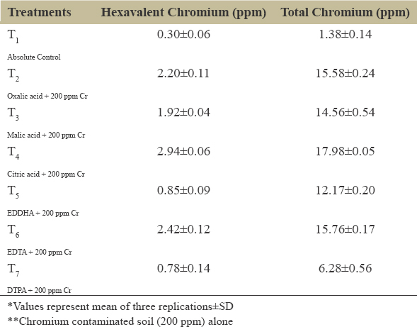 The use of chelators resulted in a considerable rise in Cr (VI) and total chromium concentration. At the end of the experiment, the maximum concentration of Cr (VI) was found in the citric acid-treated soil (T4) at around 2.94 ppm, while the lowest concentration of Cr (VI) was found in the control at 0.30 ppm [Table 1]. In a comparable manner, on the 90th day of the experiment, the total chromium concentration was 1.38 ppm in the control soil and 17.98 ppm in the citric acid-treated soil [Table 1]. Among the synthetic chelators, EDTA at 5 mmol/kg treated soil had the highest Cr (VI) and total chromium concentrations of 2.42 and 15.76 ppm, respectively.