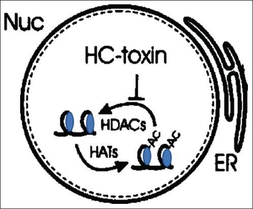 | Figure 3: Histone deacetylases are known to be inhibited by HC-toxin in the nucleus (Nuc), which leads to a hyperacetylation of histones through histone acyltransferases. It is believed that this causes alterations in gene expression that stops antifungal chemicals from being synthesized. [Click here to view] |