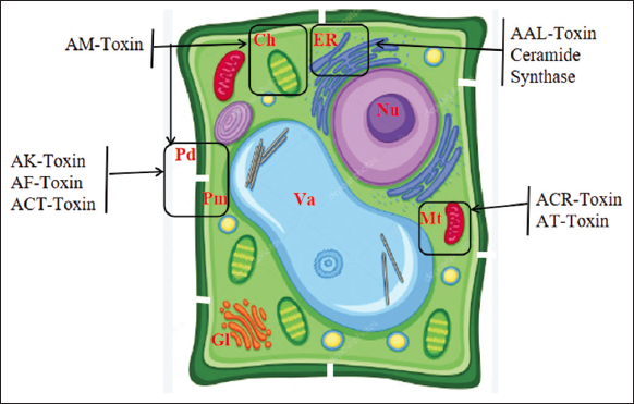 | Figure 4: Schematic presentation of target sites of host-specific toxins (HSTs) produced by Alternaria alternata. Ch, chloroplast; ER, endoplasmic reticulum; Gl, Golgi apparatus; Mt, mitochondrion; Nu, nucleus; Pd, plasmodesmata; Pm, plasma membrane; Va, vacuole. [Click here to view] |
