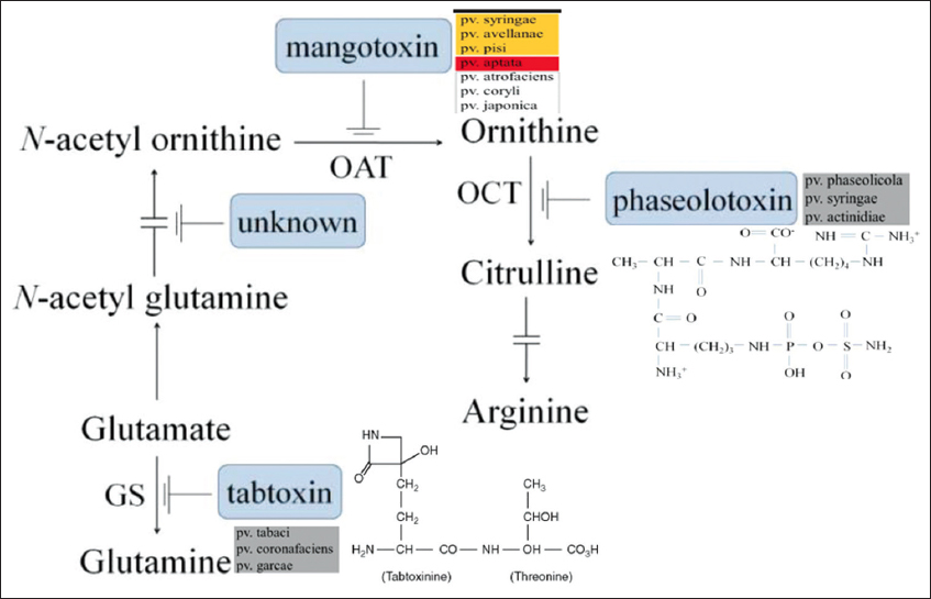 | Figure 5: The production of mangotoxin and its enzymatic target. An illustration of the processes involved in the manufacture of polyamines and arginine-glutamine. The several pathovars responsible for the synthesis of the various antimetabolite toxins are demonstrated along with the enzymatic targets of the various antimetabolite toxins, including mangotoxin. OAT, ornithine N-acetyltransferase; OCT, ornithine carbamoyltransferase; ODC, ornithine decarboxylase; and GS, glutamine synthetase [Click here to view] |