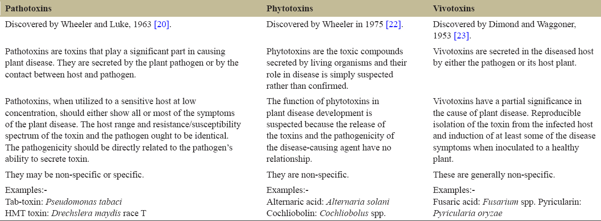 According to Wheeler and Luke [20], there are three types of toxins, namely phytotoxins, vivotoxins, and pathotoxins as mentioned in Table 1.
