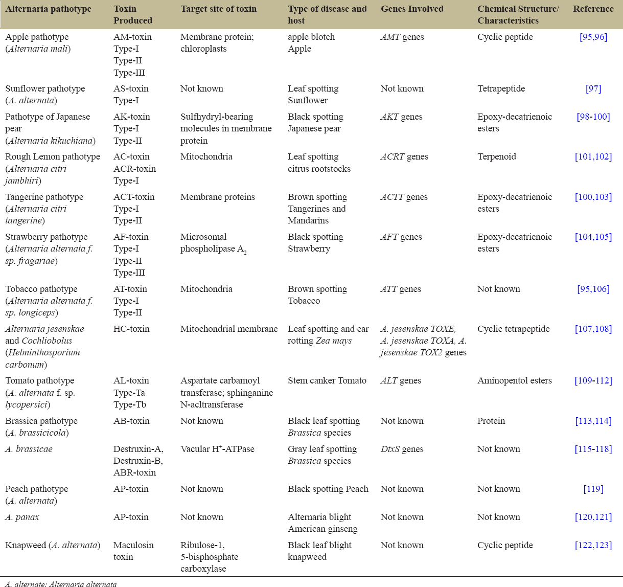 | Alternaria pathotype | Toxin Produced | Target site of toxin | Type of disease and host | Genes Involved | Chemical Structure/Characteristics | Reference |