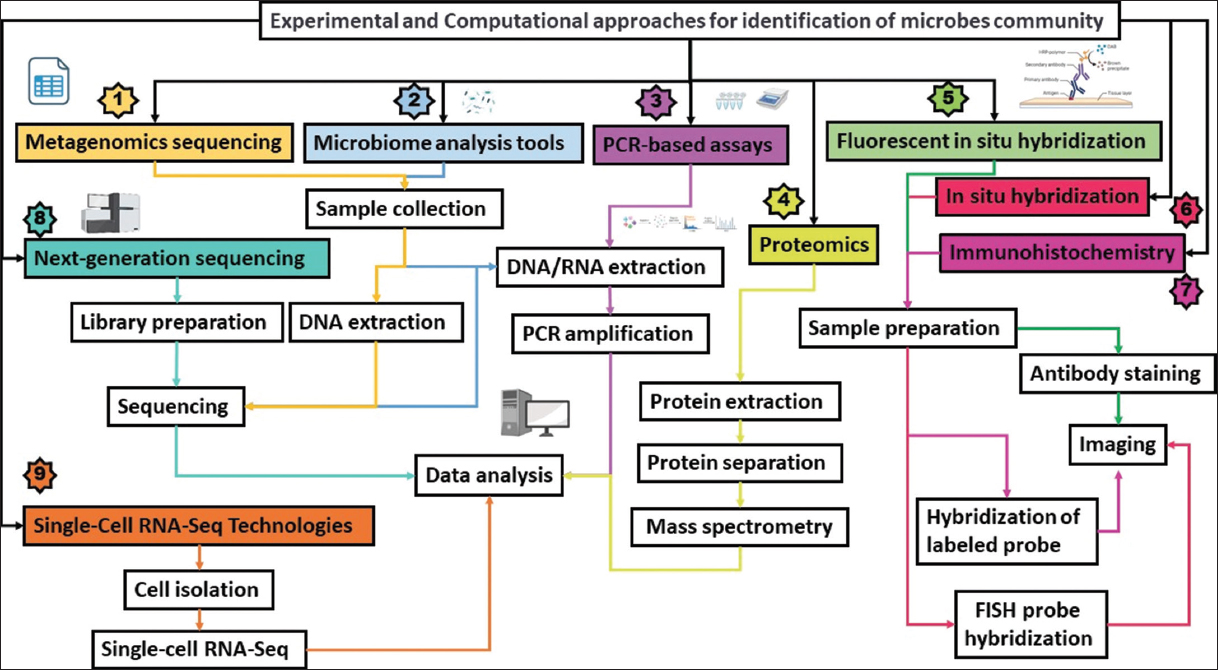 | Figure 2: Experimental and computational approaches for studying microbial pathogenesis in Alzheimer’s disease. The rectangular box is connected with the same color arrow that connects the final steps of techniques. [Click here to view] |