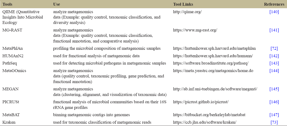 | MG-RAST | analyze metagenomics data (Example: quality control, taxonomic classification, functional annotation, and comparative analysis) | https://www.mg-rast.org/ | [141] |