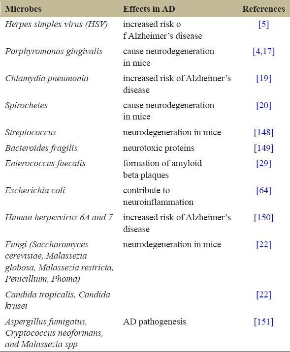| Figure 3: Potential bacteria, viruses, and fungal pathogens associated with AD development and progression. [Click here to view] |