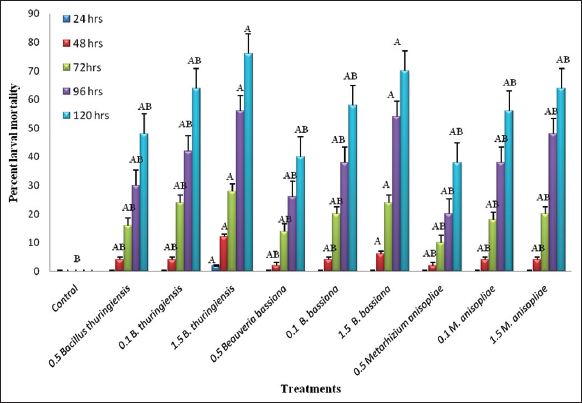 Similarly, the analysis of variance was determined for the 4th instar larvae of S. litura. The results revealed that in the 4th instar larvae of S. litura, maximum 76 ± 0.23% larval mortality was observed after 120 h in the treatment concentration of 1.5% B. thuringiensis, followed by the highest concentration of 1.5% B. bassiana having 70 ± 0.21% mortality, and M. anisopliae causing 64 ± 0.20% larval mortality after 120 h exposure to these bioinsecticides (F = 1.10, df = 9, P < 0.05) [Figure 3]. The calculated median lethal concentration in probit analysis demonstrated the lowest LC50 = 1.59/10 larvae (95% FL: 1.08-2.36) with Pearson’s χ2 value of 0.52 amongst the 4th instar larvae after 72 h. The P-value in this study was <0.05, indicating that all the concentrations of bioinsecticide inoculum were statistically significant and all the other treatments were superior to the control.