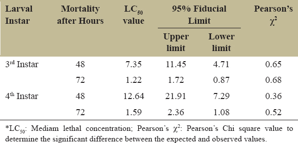 *LC50: Mediam lethal concentration; Pearson’s c2 : Pearson’s Chi square value to determine the significant difference between the expected and observed values.