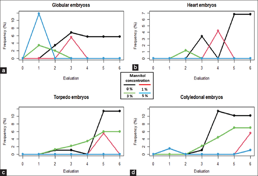 The addition of D-Mannitol at a concentration of 5% was notable with the generation of 11.8% globular embryos on the 7th day. However, this type of embryos disappeared at 14 DAS and, in general, this was the treatment with the lowest frequency of embryos [Figure 2a]. The highest frequency of formation of heart stage embryos was obtained in the absence of D-Mannitol with a maximum frequency of 6.8% at 49 DAS [Figure 2b].