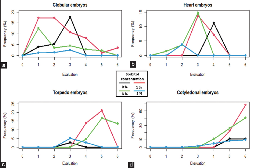 The 1% sorbitol allowed the largest number of embryos compared to the other concentrations and the absence of this osmoregulator. Embryos in the globular, heart, torpedo and cotyledonary stages reached frequencies of 17.2% in the first 7 days [Figure 3a], 14.7% at 21 DAS [Figure 3b], 21% at 49 DAS [Figure 3c], and 57.9% frequency of embryo formation at 63 DAS [Figure 3d], respectively.