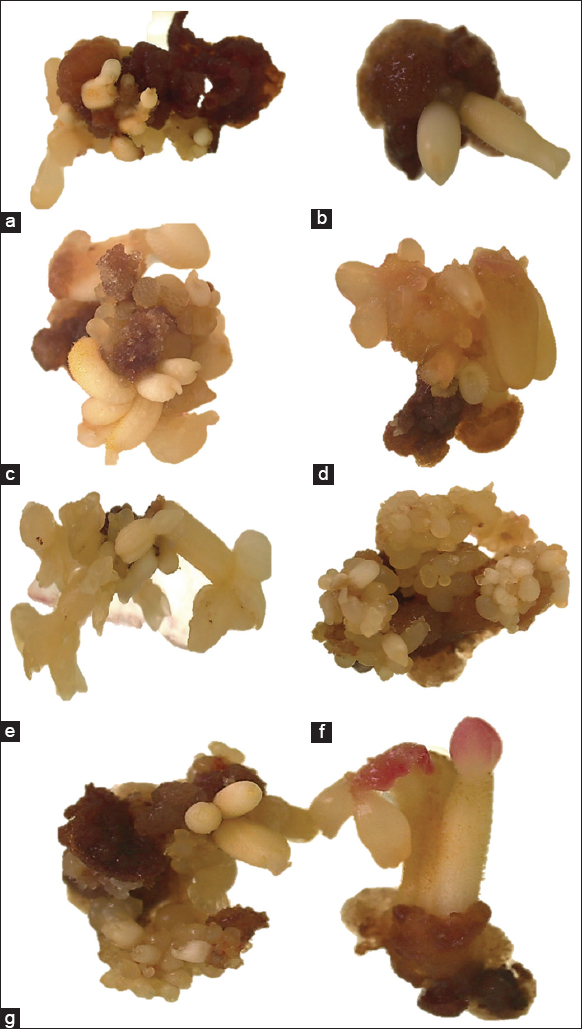 The absence of D-Mannitol in the culture medium allowed higher frequencies of embryo formation with 11.4% in the torpedo stage at 49 DAS [Figure 2c] and 11.4% in the cotyledonary stage at 35 DAS [Figure 2d]. From the last cotyledonary stage, it is possible to generate complete plants.