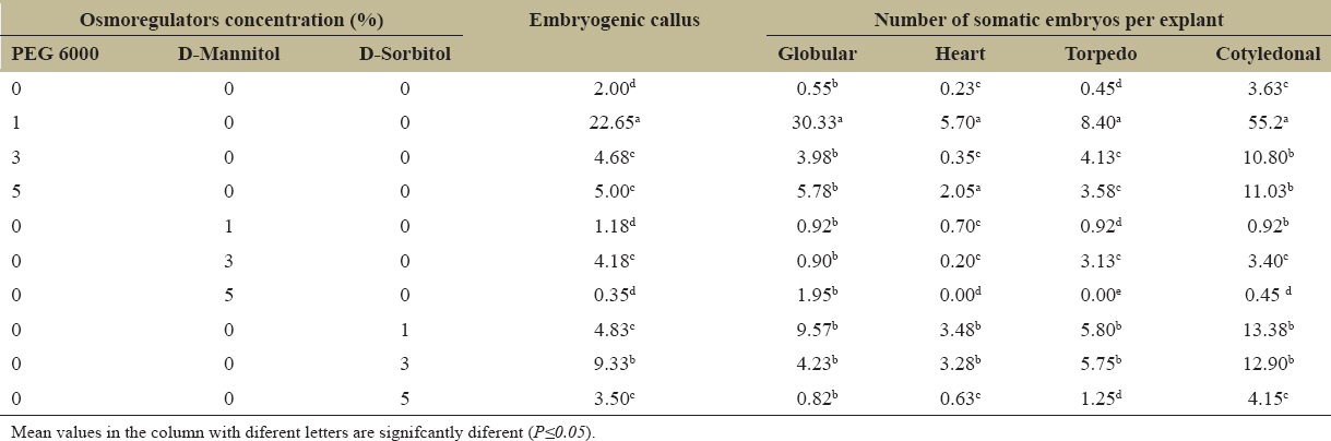 The osmotic potential of the culture medium can affect the development and percentage of somatic embryo formation [23]. As a solution, high molecular mass osmotic agents such as polyethylene glycol (PEG) and polyols (D-Mannitol and D-Sorbitol), which could reduce the osmotic potential in the culture medium, have been used. Thus, the application of these osmotic agents has increased the rate of somatic embryo multiplication in different species [24-26].