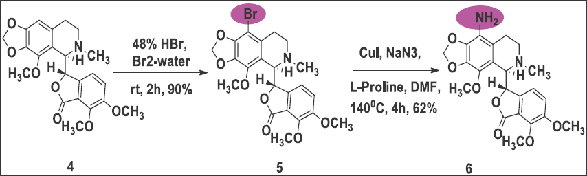 | Reaction Scheme 1: The chemical synthesis of 9-bromonoscapine (3) and 9-aminonoscapines (6) using the drug noscapine as starting material. [Click here to view] |