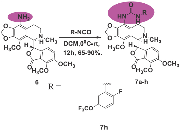 The production of noscapine derivatives poses considerable challenges owing to the delicate C-C bond linking two heterocyclic phthalide and isoquinoline components within the molecular structure. Nevertheless, we have effectively fine-tuned the reaction conditions to safeguard the stability of this bond. To initiate the synthesis, we utilized natural α-noscapine (4) as the starting material and achieved a high yield (90%) in the synthesis of 9-bromonoscapine (5) by modifying the reaction conditions described in the literature [9]. Subsequently, we converted 9-bromonoscapine to 9-aminonoscapine (6) in a 62% yield using CuI, Sodiumazide, and L-Proline in DMSO at 135°C for 3 h [Reaction Scheme 1]. It is important to note that the reaction scheme employed in our study differs from the previously reported facile synthesis of 9-aminonoscapine [10], and our reaction conditions have no impact on the sensitive C-C bond. Next, we introduced approximately measured alkyl/aryl isocyanates (7a-h) at a quantity of 1.2 millimoles to a solution containing 9-aminonoscapine, 6 (1.0 millimole), in DCM (10 mL), and stirred the mixture for 12 h at room temperature. Following confirmation of reaction completion through TLC analysis, we subjected the contents to washing with a brine solution [10]. The organic layer was gathered, filtered through a Na2SO4 bed, and subsequently evaporated under reduced pressure. The resulting crude residue underwent chromatography over a triethylamine silica bed using pet. Ether/ethyl acetate (3:2) as eluents, yielding solid products, including the pure compound 7 h. The final products were characterized using IR, 1H, and 13C NMR spectroscopy, and mass spectrometry techniques, with yields ranging from 65% to 90% [Reaction Scheme 2].
