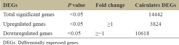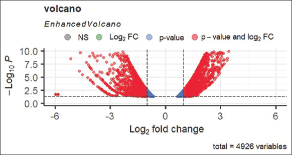 | Figure 1: The volcano plot visually represents the distribution of differentially expressed genes. Red dots indicate upregulated genes, blue dots represent non-differentially expressed genes, and downregulated genes are depicted by red dots on the negative side. This plot helps identify significant gene expression changes and allows researchers to focus on relevant genes for further analysis (P-value). It shows that the downregulated distribution of genes is more than upregulated gene distribution, which is showing in Figure 1. [Click here to view] |