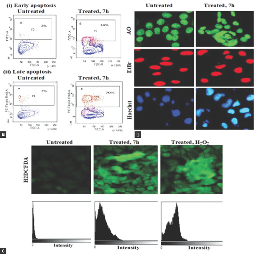 | Figure 2: Induction of apoptosis by the urea derivative of noscapine (urea-noscapine). Flow cytometry analysis of cells showing increased percentage of early and late apoptosis with the treatment of urea-noscapine 7 h derivative for 72 h compared to untreated cells, (a) flow cytometry of apoptosis cell, (b) morphological changes in cell line, (c) analysis of reactive oxygen species activity in cell line. [Click here to view] |