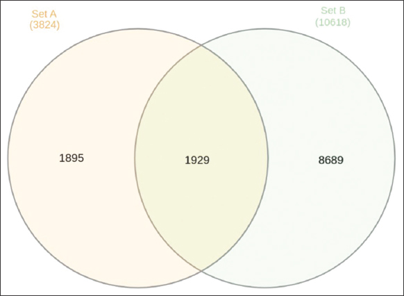 Figure 3 illustrates the comparison of upregulated and downregulated genes, as well as unique and shared genes, in urea-noscapine-treated samples in relation to the control. Set A denotes the count of upregulated genes, while Set B represents the count of downregulated genes. Among 3824 variables, 1895 unigenes were identified in upregulated genes, and for downregulated genes, 8689 unigenes were identified out of 10618 variables. In addition, a total of 1929 genes were identified as common to both the upregulated and downregulated categories.